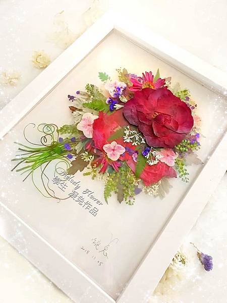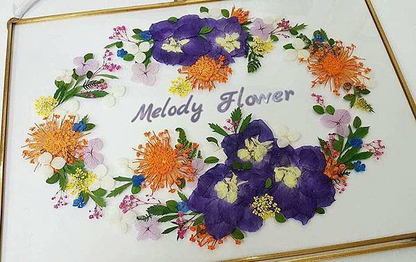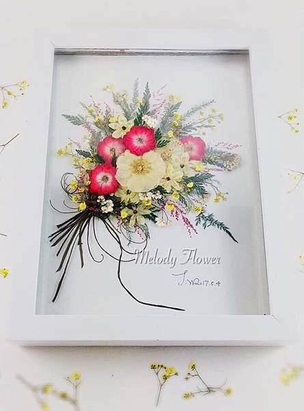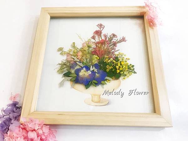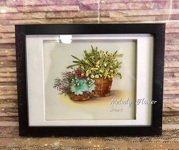 押花小盆栽與木桶是屬於靜物的表現,花材種類多元多樣,所以不只要考慮色彩的搭配還要選擇花的種類與花的尺寸,方能達到畫面的平衡。