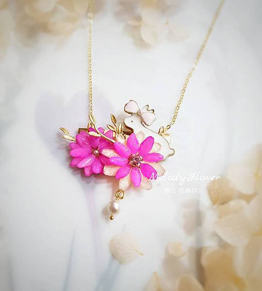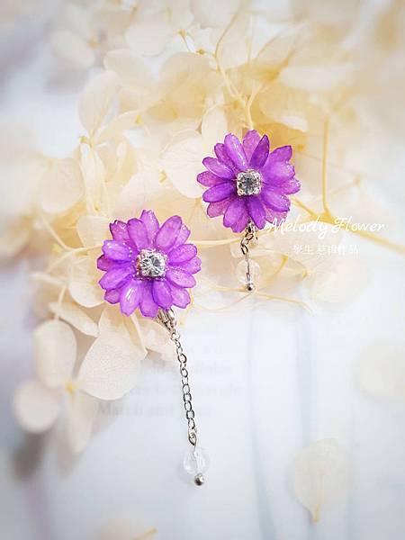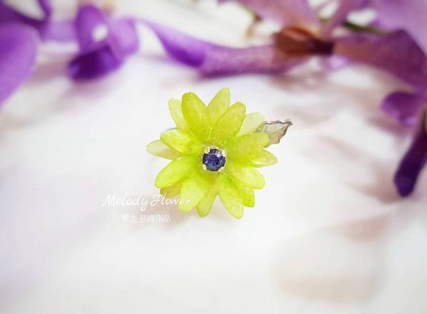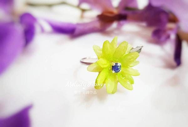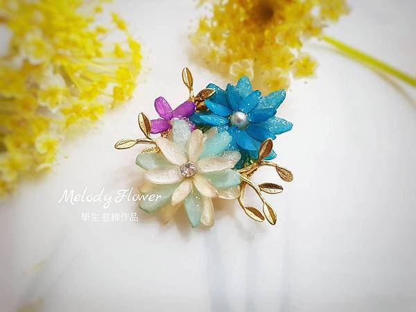 今天跟大家分享的這些色彩繽紛充滿活力,又帶點小女孩氣息的小雛菊真花珠寶作品,是第二次來上我課程的學生--慈緯的作品,慈緯是一位靦腆可愛的大學生,喜歡彩度很高的色彩,如同我對大學生的印象,充滿著活力純淨的感覺,這顏色是讓人覺得很快樂的色彩。
